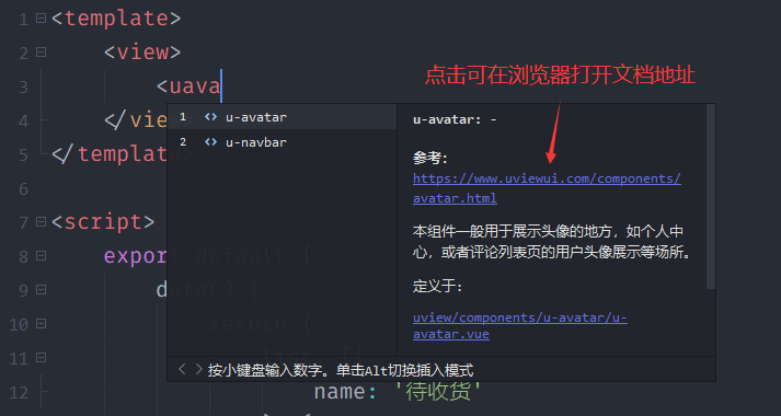 <u关键字(无需<u-后面的-),HX会通过弹出提示列出uView的所有组件 - 可以在提示中一键直达对应组件的官方文档