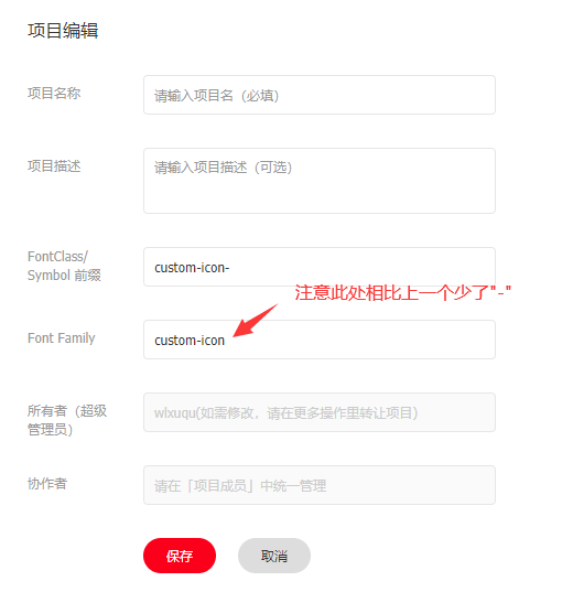 - 修改"FontClass/Symbol 前缀"项为"custom-icon-",修改"Font Family"为"custom-icon",如下图: